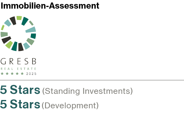 GRESB bewertet die Nachhaltigkeitsperformance von Immobilienanlagen weltweit. Im Assessment 2025 zählt Swiss Prime Site Immobilien in den Kategorien «Standing Investment» und «Development» mit hervorragenden Resultaten zur internationalen Spitzengruppe. Zudem sind die sogenannten GRESB Scores als zu erreichende ESG-Ziele in der variablen Vergütung der Gruppenleitung verankert und haben damit direkten Einfluss auf die Unternehmenssteuerung.