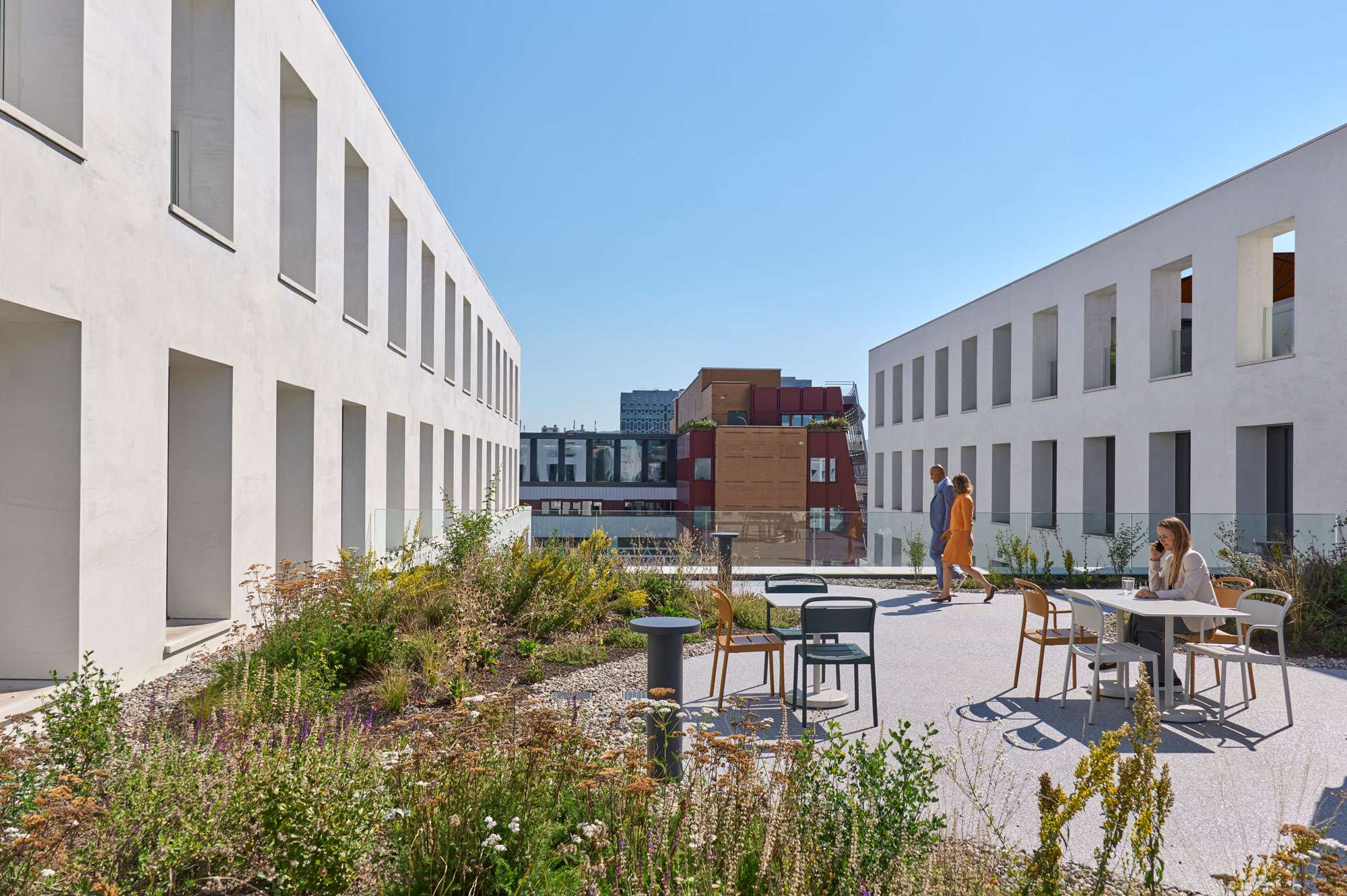 Complementing the open, light-flooded architecture are a number of planted terraces that create a harmonious connection between indoor and outdoor space. These green retreats not only promote the wellbeing of users, they also improve biodiversity and the microclimate throughout the campus. Combined with the range of leisure and gastronomy options on the site, this results in an inspiring environment that actively supports interaction between tenants and with the surrounding neighbourhood.