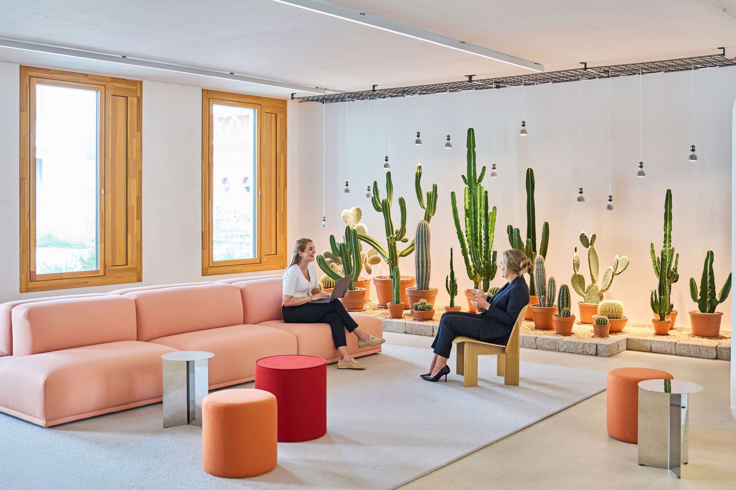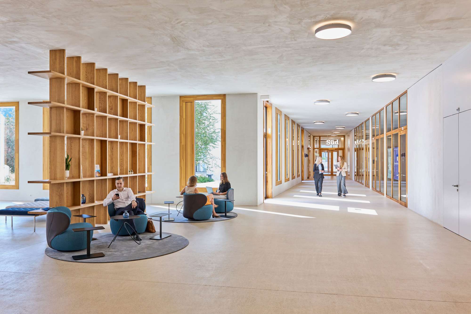 This is a groundbreaking building, developed in line with the sustainable 2226 concept of the architects Baumschlager Eberle. It is a concept that completely dispenses with active heating, cooling and mechanical ventilation. Instead, solid walls, sensor-controlled ventilation elements and optimally positioned windows ensure a pleasant indoor climate all year round – without the need for conventional building plant.
